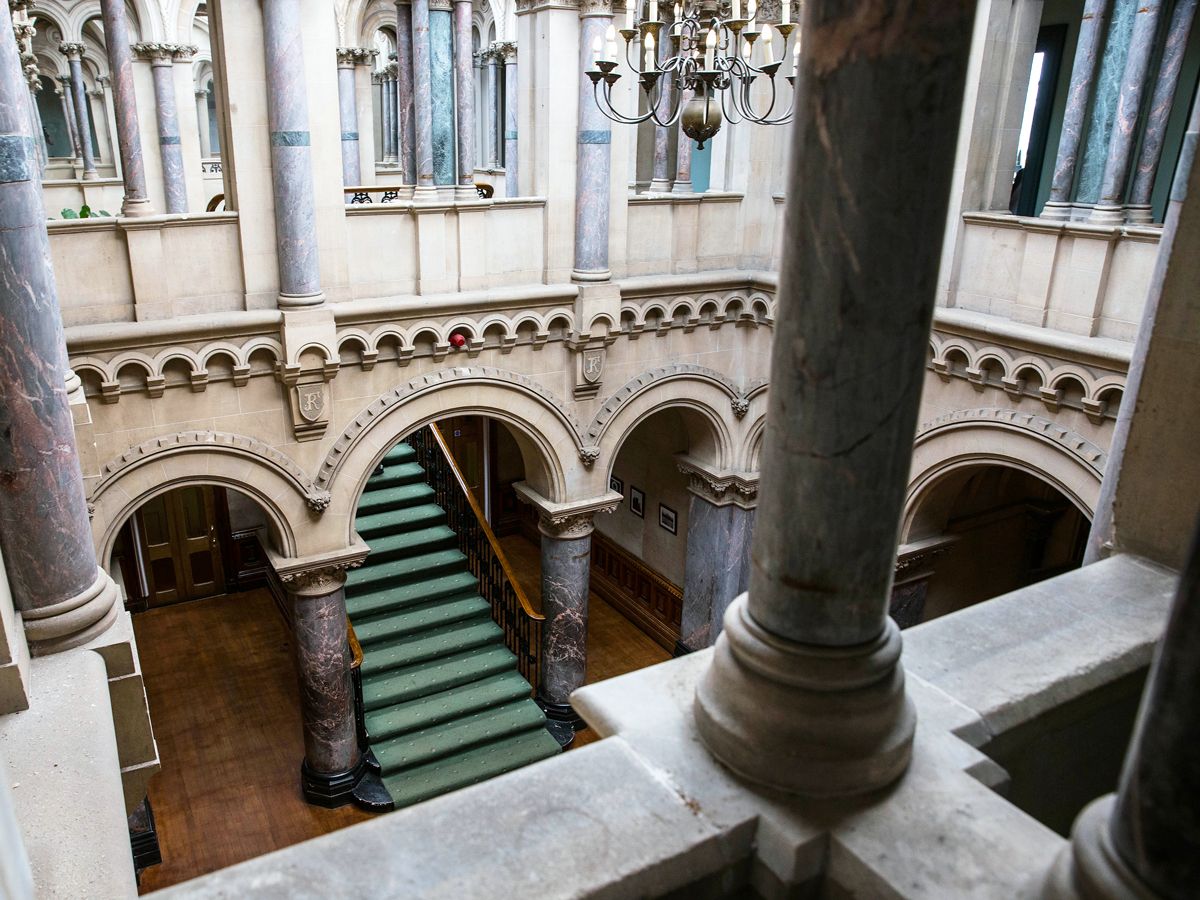 According to historic accounts, Ruth agreed to marry John only if he built her a castle on a hill. In 1866, Fielden commissioned renowned architect John Gibson of London to build Dobroyd Castle. Completed in 1869, the castle became the couple’s permanent home, with 66 rooms, a 17-horse stable, and the couple’s initials carved throughout as a testament to their love.